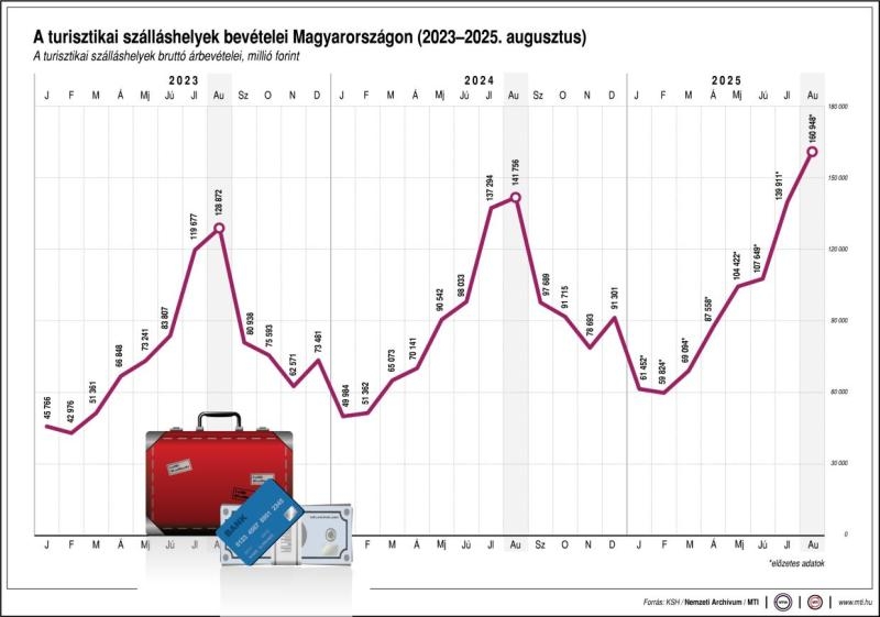 2025 első nyolc hónapjában mintegy 13,5 millió vendég érkezett a magyarországi szálláshelyekre, 6,2 százalékkal több mint 2024 azonos időszakában. Az ezalatt az idő alatt regisztrált 32,9 millió vendégéjszaka pedig 3 százalékkal múlta felül a tavaly január-augusztusi értéket.