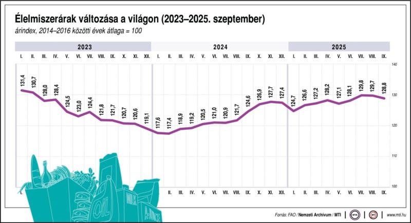Szeptemberben a nemzetközi élelmiszer-nyersanyagárak irányadó átfogó árindexe 128,8 pontra csökkent az előző havi 129,7 pontról. A szeptemberi érték 3,4 százalékkal magasabb az egy évvel korábbinál, azonban 19,6 százalékkal elmarad a 2022 márciusában beállított csúcstól.