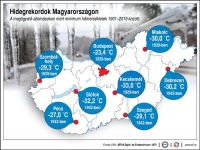 Vasárnapra virradóra megdőlt az országos napi minimum hőmérsékleti rekord. A Pest megyei Tésán mínusz 28,1 Celsius-fokig hűlt a levegő.Mostanáig ezen a napon 1985-ben, a Nógrád megyei Romhányon volt a leghidegebb, akkor mínusz 26,5 fokot mértek.