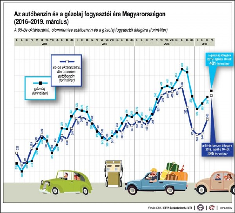A benzin ára 2012. április elején érte el csúcsát, akkor egy liter átlagosan 451 forintba került. A gázolaj literje 2012. január közepén volt a legdrágább, átlagosan 449 forint.