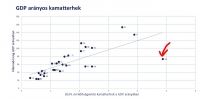 A grafikon függőleges tengelye mutatja, hogy melyik országnak milyen mértékű a GDP arányos államadóssága, a vízszintes tengely pedig azt, hogy a GDP arányában mekkora kamatköltséget visel. És nem véletlen, hogy Magyarország helye már 2024-ben teljesen elcsúszott a grafikonon, mert hiába tartozik az EU átlagába az adósságállományunk, ha közben kamatban a többszörösét fizetjük rá, mint bárki más. Lehet tehát az olaszoknak a GDP 140 százalékát közelítő, vagy a görögöknek a GDP 150 százalékát meghaladó adósságuk, de még ők is csak a GDP 3-4 százaléka közötti kamatot fizetik ki rájuk, míg mi közel a GDP 5 százalékát fizettük ki kamatok formájában egy fele akkora adósságállományra már 2024-ben is és ez az adat azóta csak romlott.